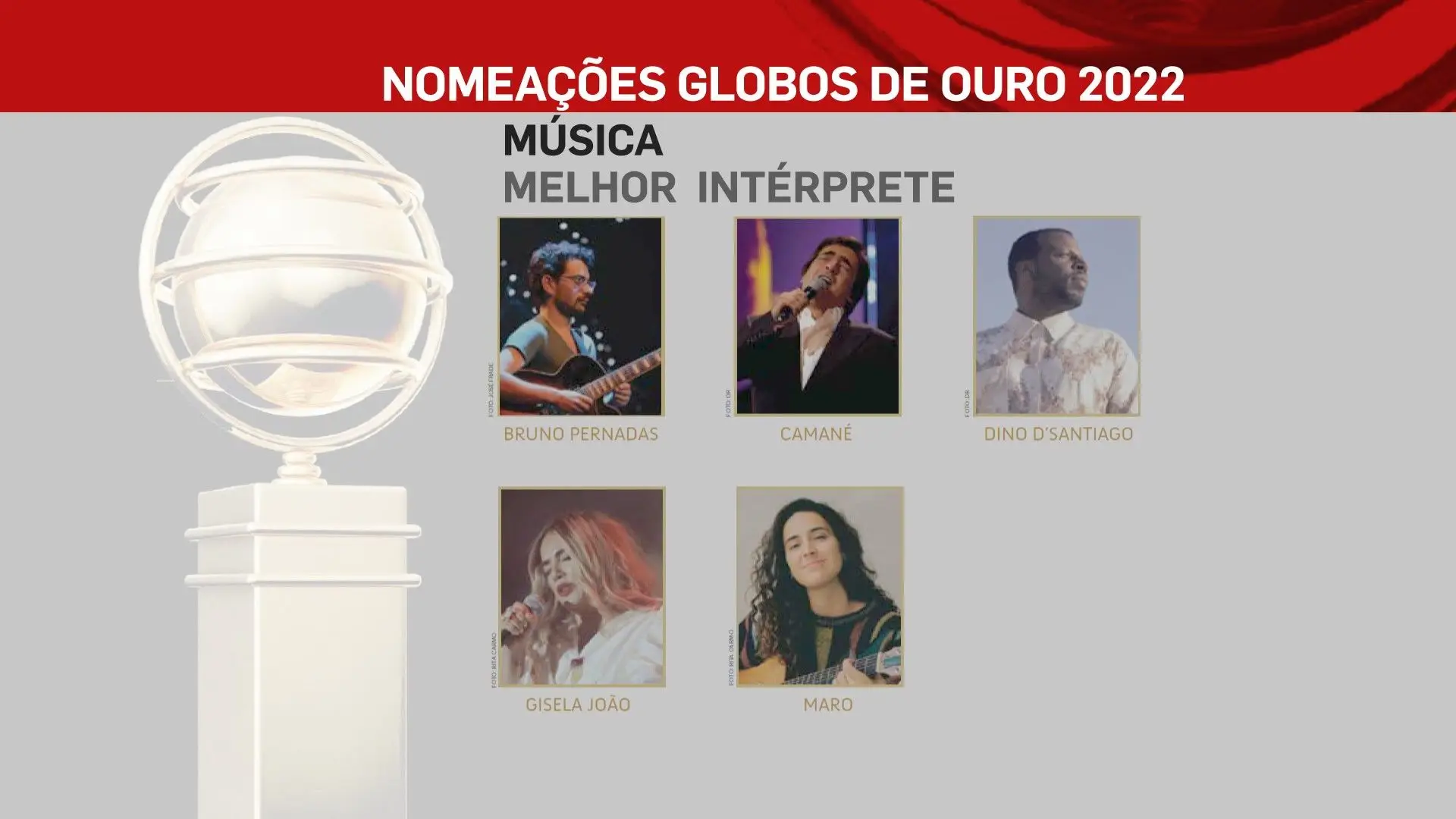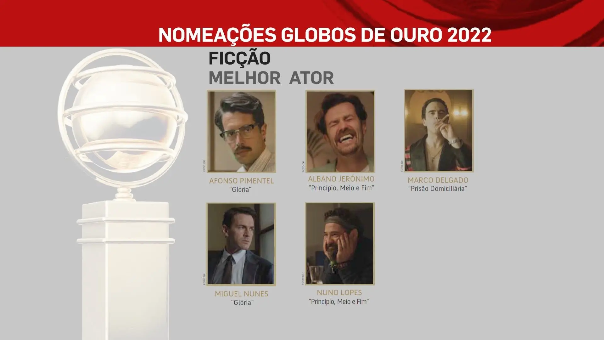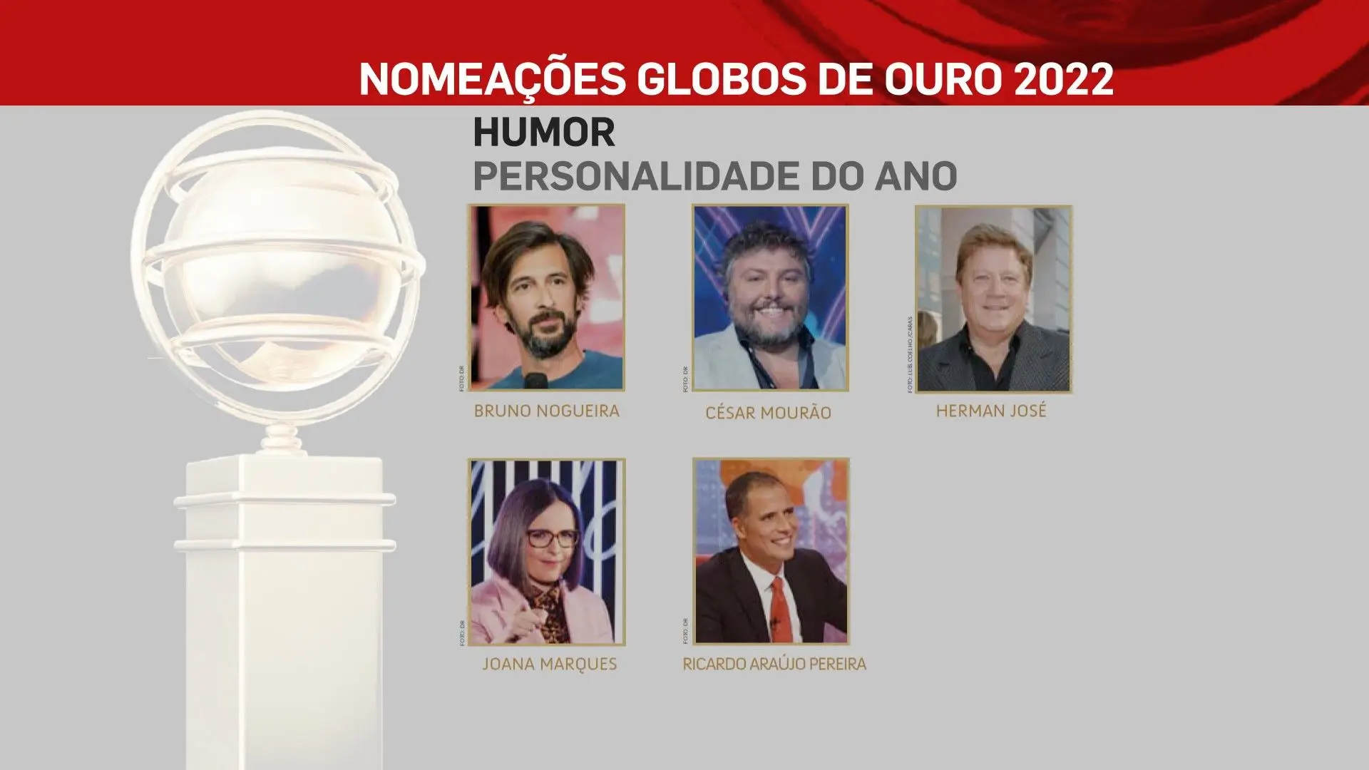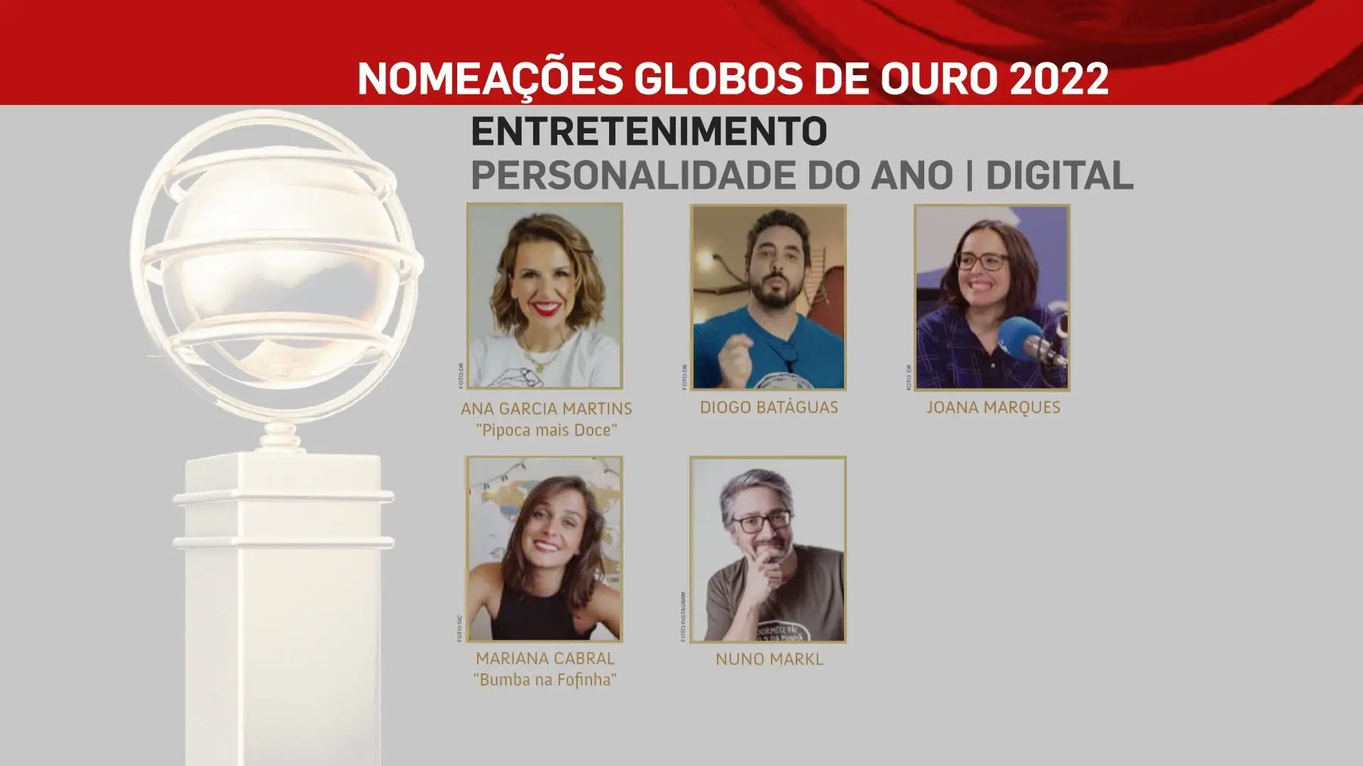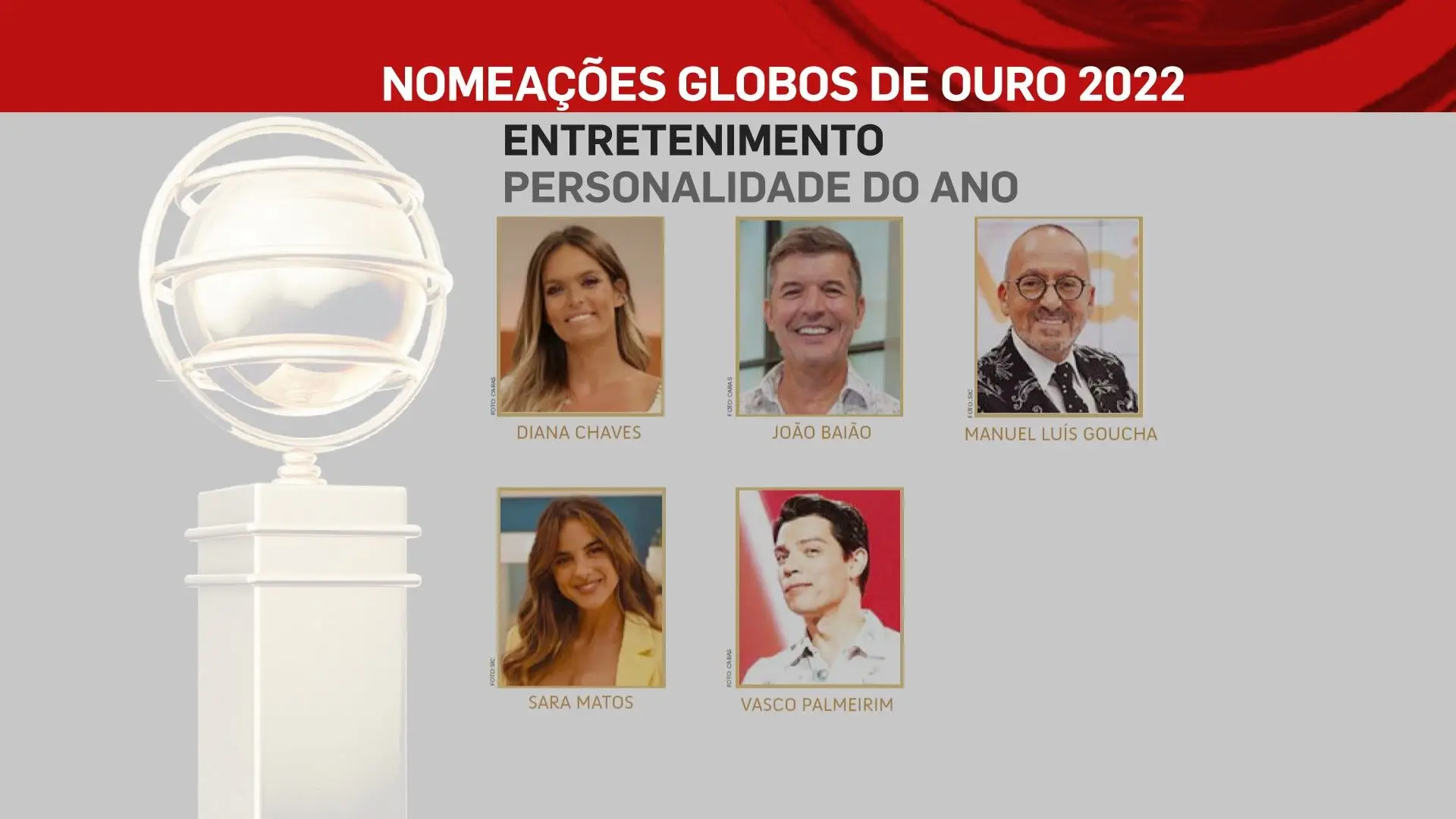 A 2 de outubro, domingo, a SIC vai transmitir a 26ª edição dos Globos de Ouro, na qual vamos ficar a saber quem são os vencedores das sete categorias: Cinema, Entretenimento, Humor, Ficção, Música e Teatro. No total estão nomeados 80 profissionais, cujos nomes podes ficar a conhecer na lista que se segue.