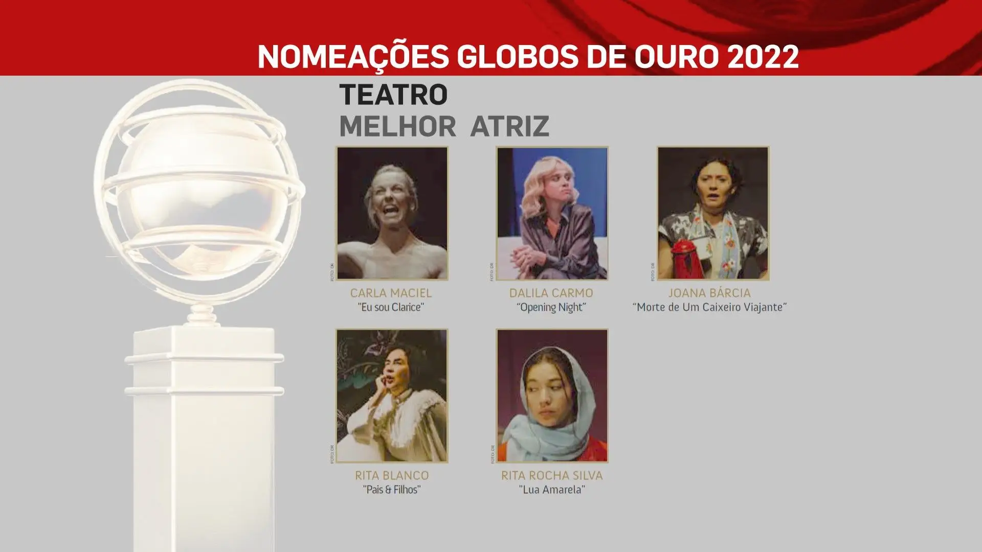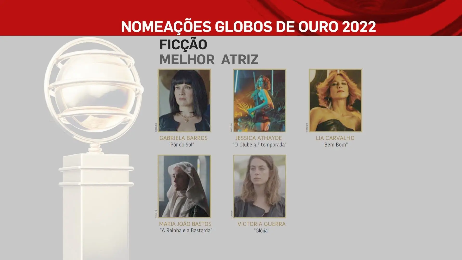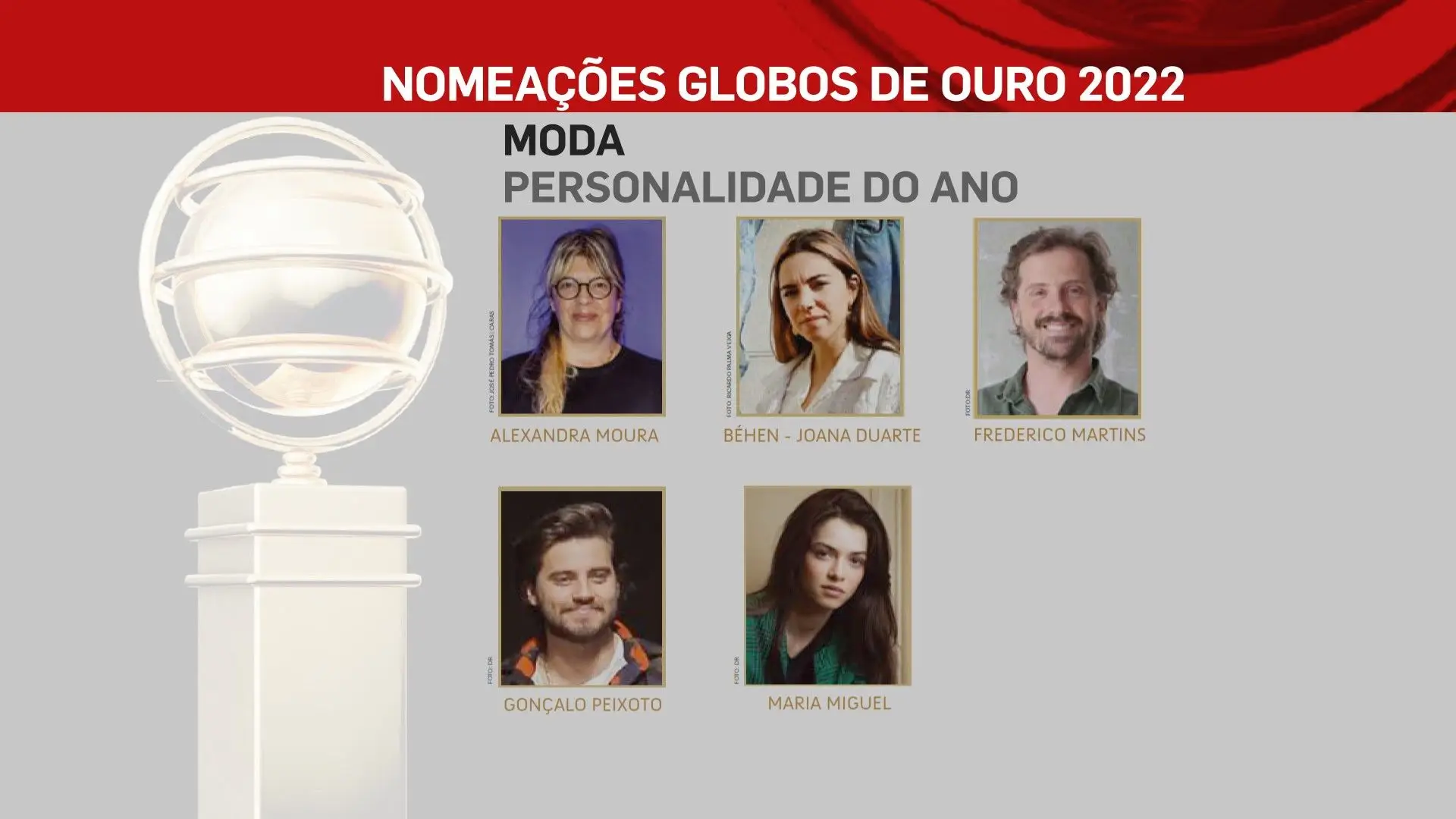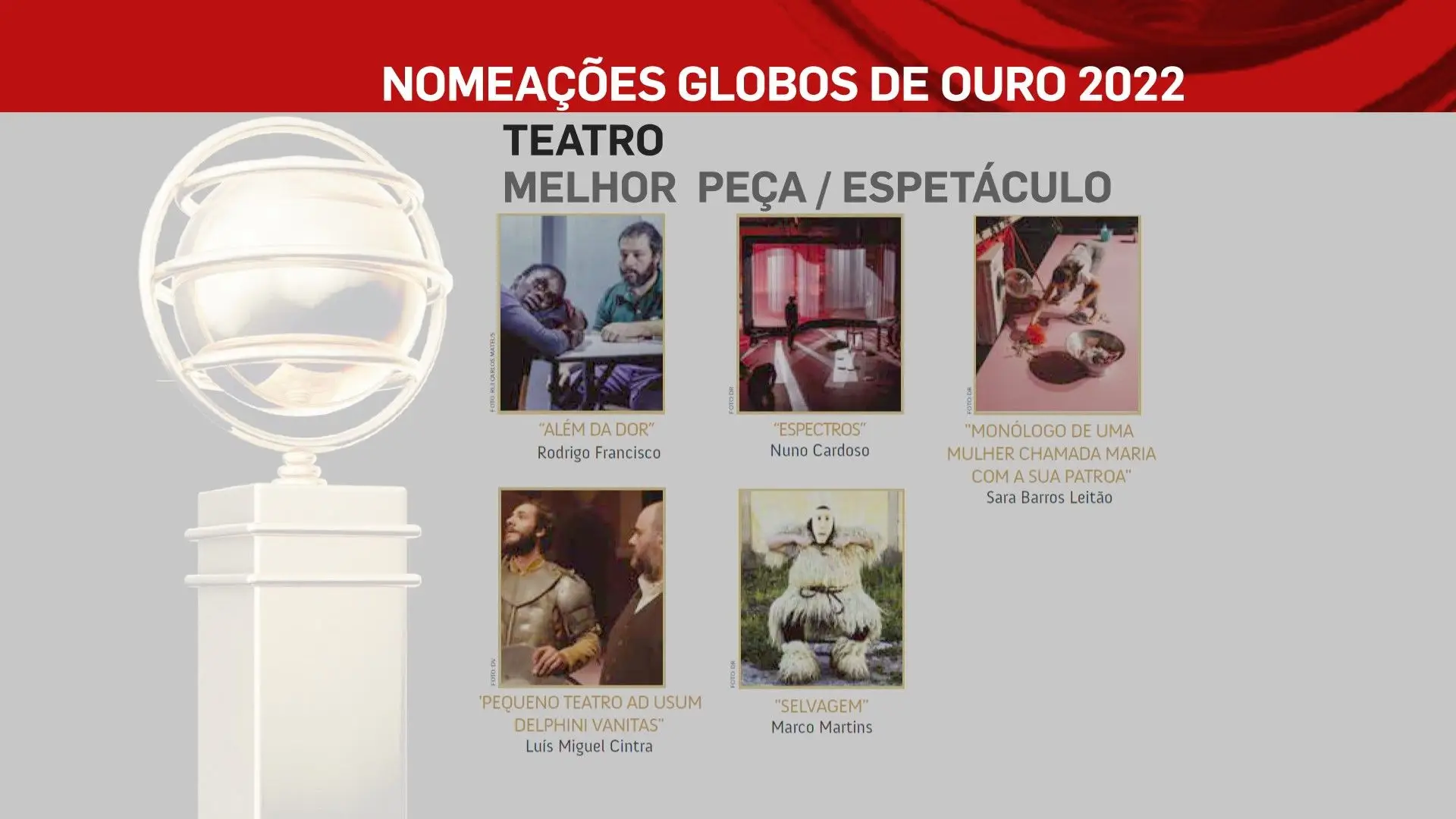 A 2 de outubro, domingo, a SIC vai transmitir a 26ª edição dos Globos de Ouro, na qual vamos ficar a saber quem são os vencedores das sete categorias: Cinema, Entretenimento, Humor, Ficção, Música e Teatro. No total estão nomeados 80 profissionais, cujos nomes podes ficar a conhecer na lista que se segue.