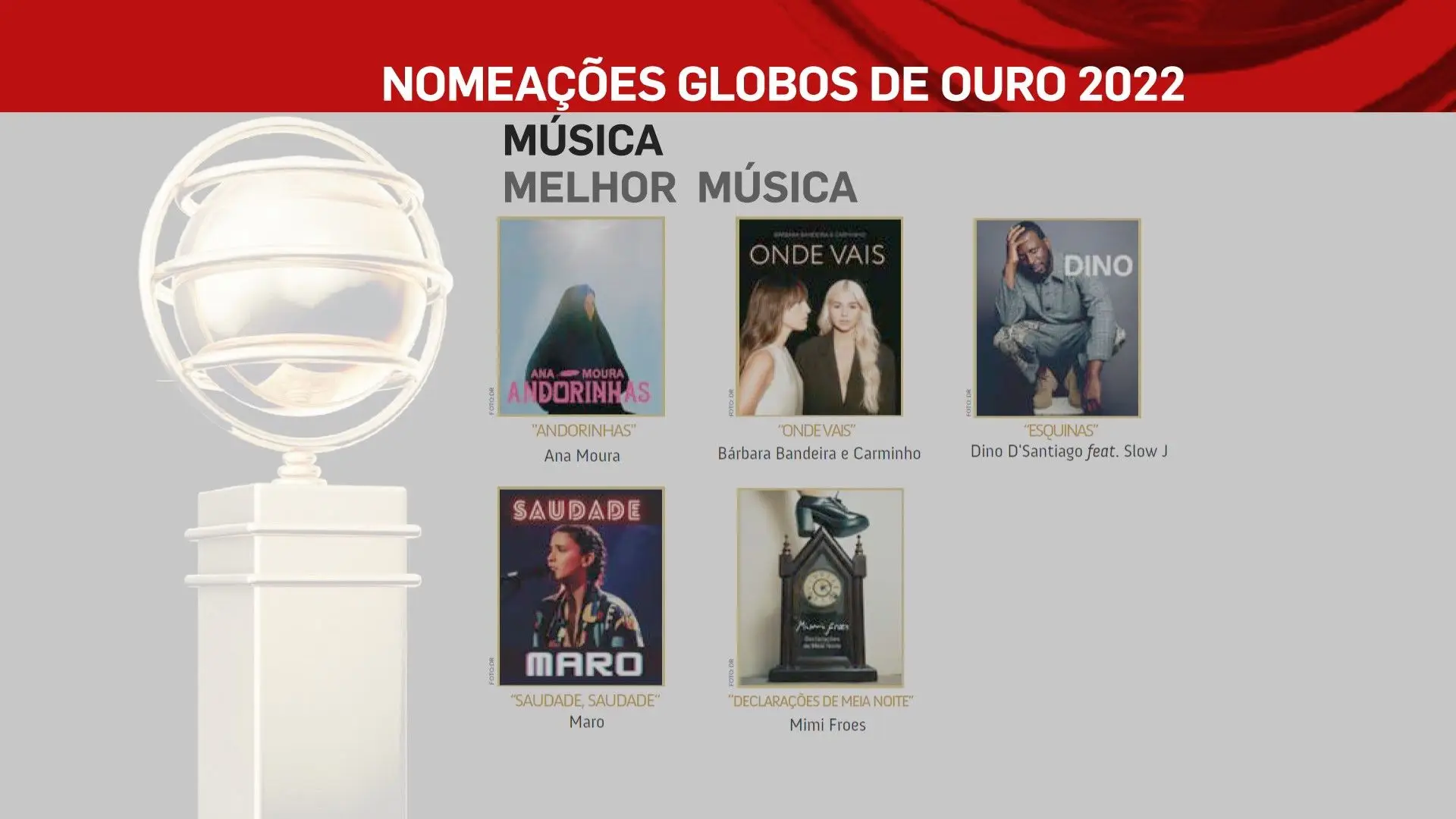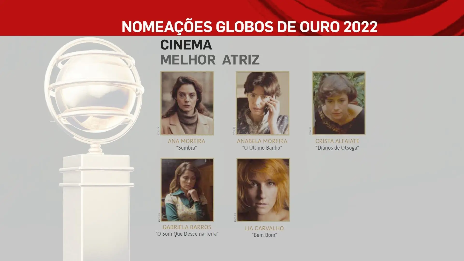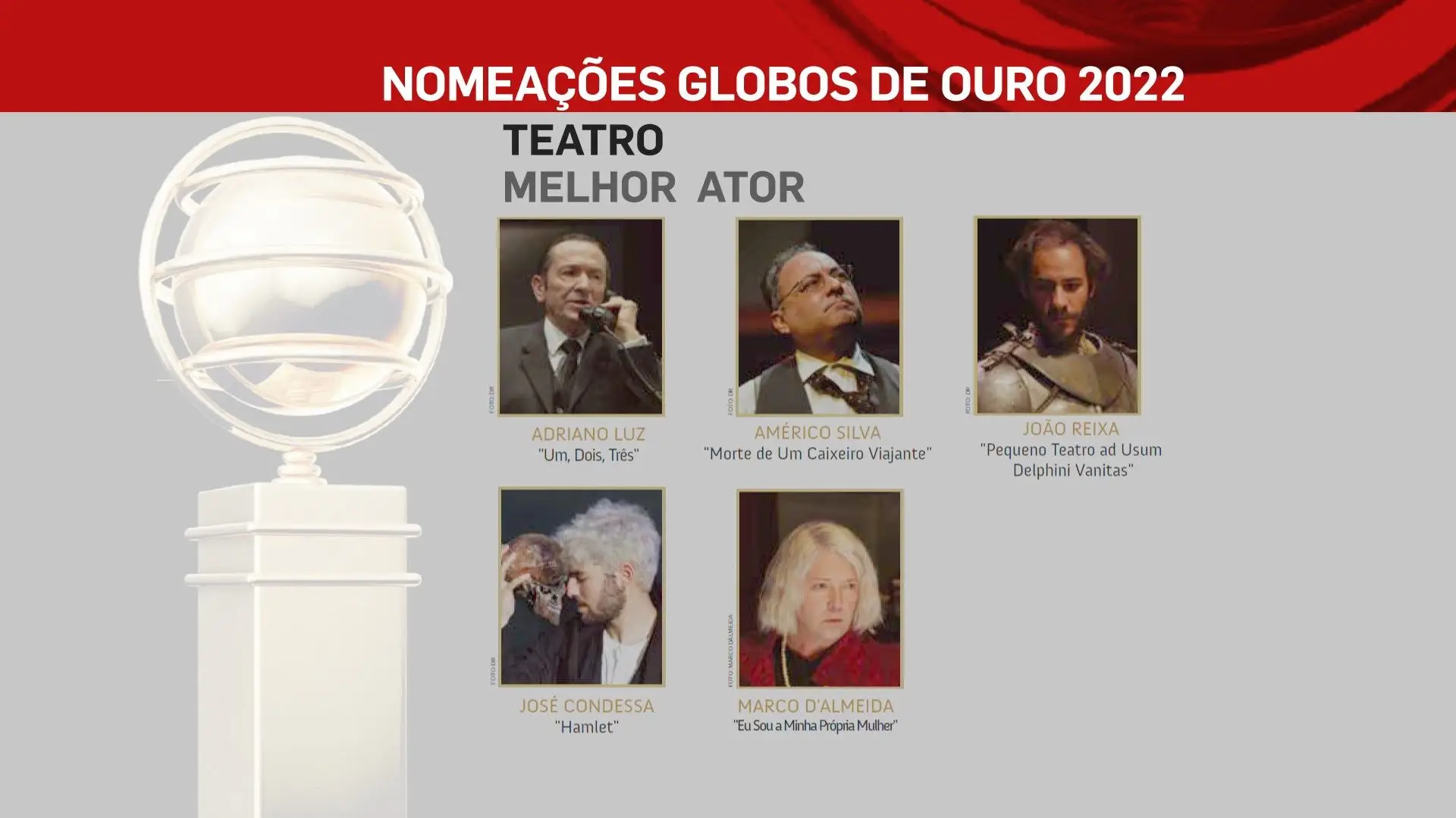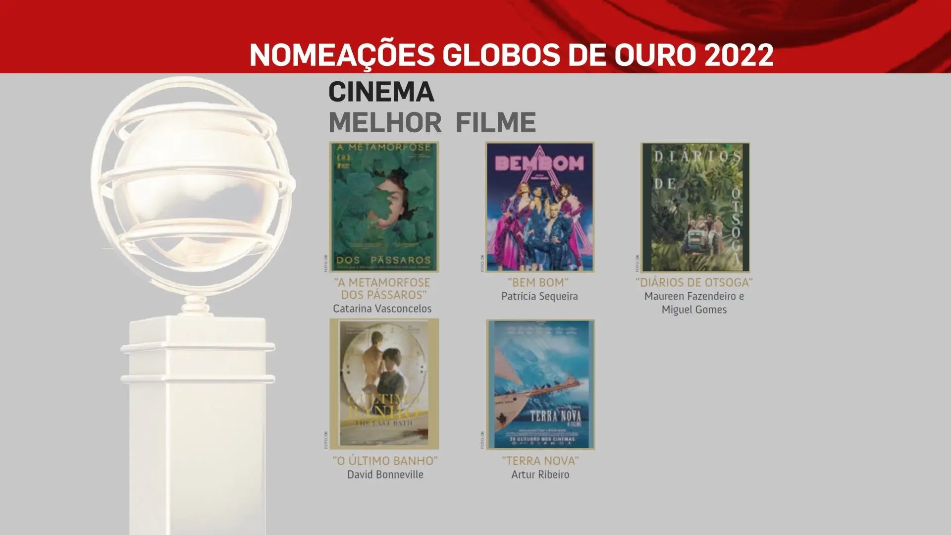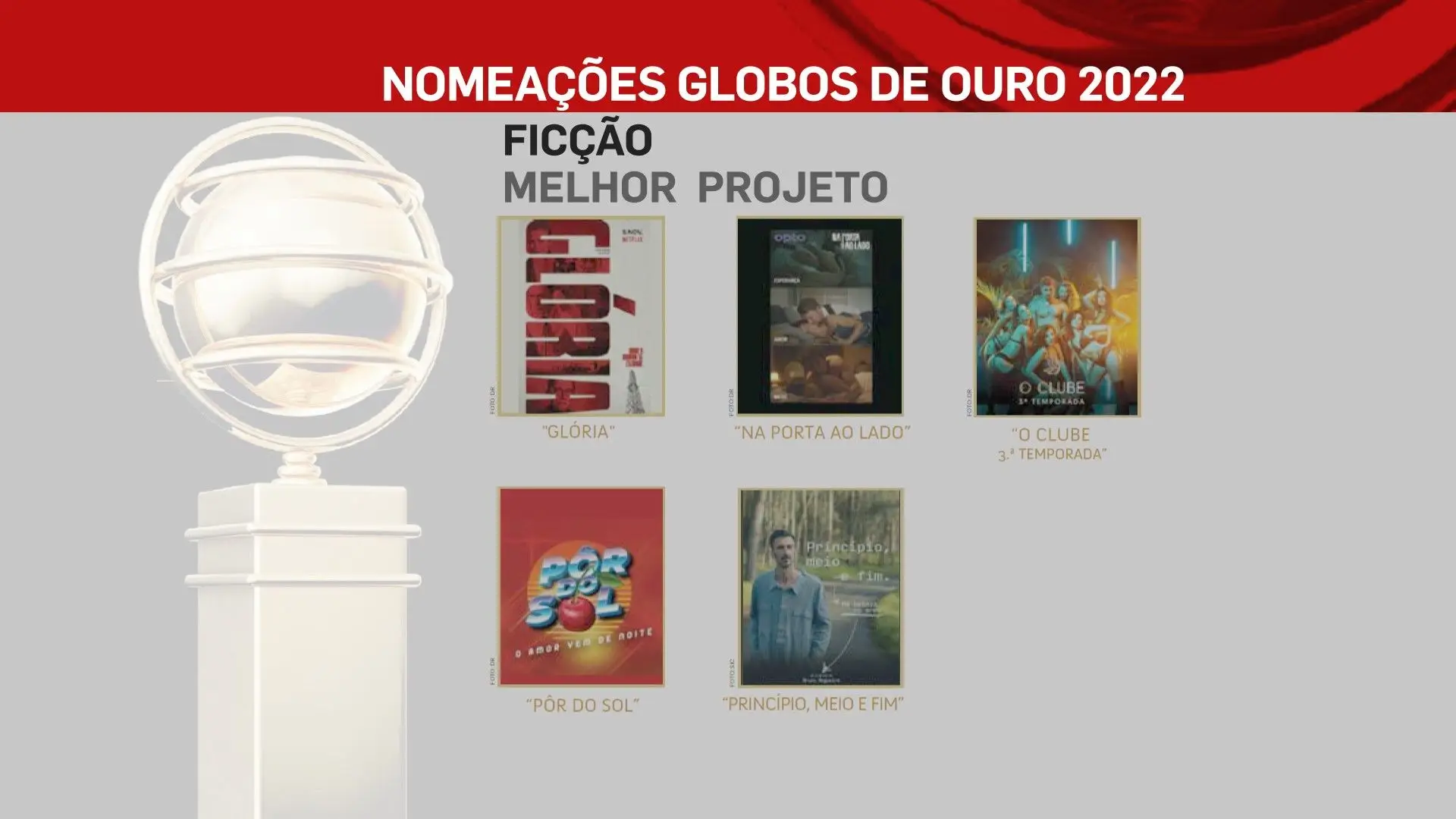 A 2 de outubro, domingo, a SIC vai transmitir a 26ª edição dos Globos de Ouro, na qual vamos ficar a saber quem são os vencedores das sete categorias: Cinema, Entretenimento, Humor, Ficção, Música e Teatro. No total estão nomeados 80 profissionais, cujos nomes podes ficar a conhecer na lista que se segue.